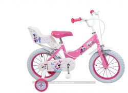 Ideal para niñas de 5 o 6 años, esta bicicleta de color rosa con dibujos del mundo Disney incluye ruedines, asiento trasero y cubre-cadenas completo. Dimensiones: 73,7 x 18,8 x 43,4 cm.