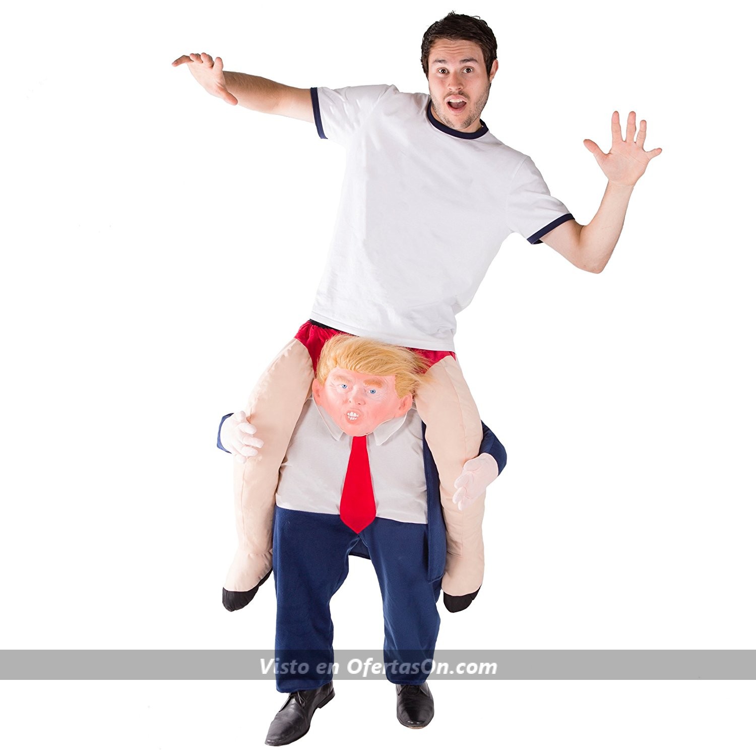 disfraz a hombros de donald trumpSi quieres triunfar estos carnavales, aprovecha esta oportunidad de ir a hombros del personaje más polémico del último año: el mismísimo Donald Trump. Pero con este disfraz, es Donald Trump quien te lleva a hombros, y no al revés. Es un disfraz para adultos de talla única (cintura elástica con cinturón de hasta 42″). Además, el conjunto pesa solo 1 Kg, por lo que podrás moverte con libertad, algo que a Trump no le gusta mucho.