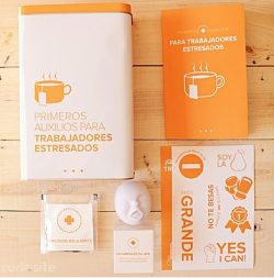 Porque sabemos que es un coñazo ir a trabajar, hoy te traemos este kit de primeros auxilios para trabajadores estresados, en el que te encontrarás un libro lleno de consejos que te ayudarán a afrontar el trabajo sin que te provoque estrés, dos bolsitas de infusión relajante, un set de 13 pegatinas de motivación para que pegues en tu zona de trabajo y -no podía faltar- una bola antiestrés con forma de cabeza humana, para que puedas ponerle la cara que más odies en cada momento. ¿Tienes amigos estresados por su trabajo? Imagínate las risas que os echaréis cuando abra este kit y vaya descubriendo las cosas que incluye.